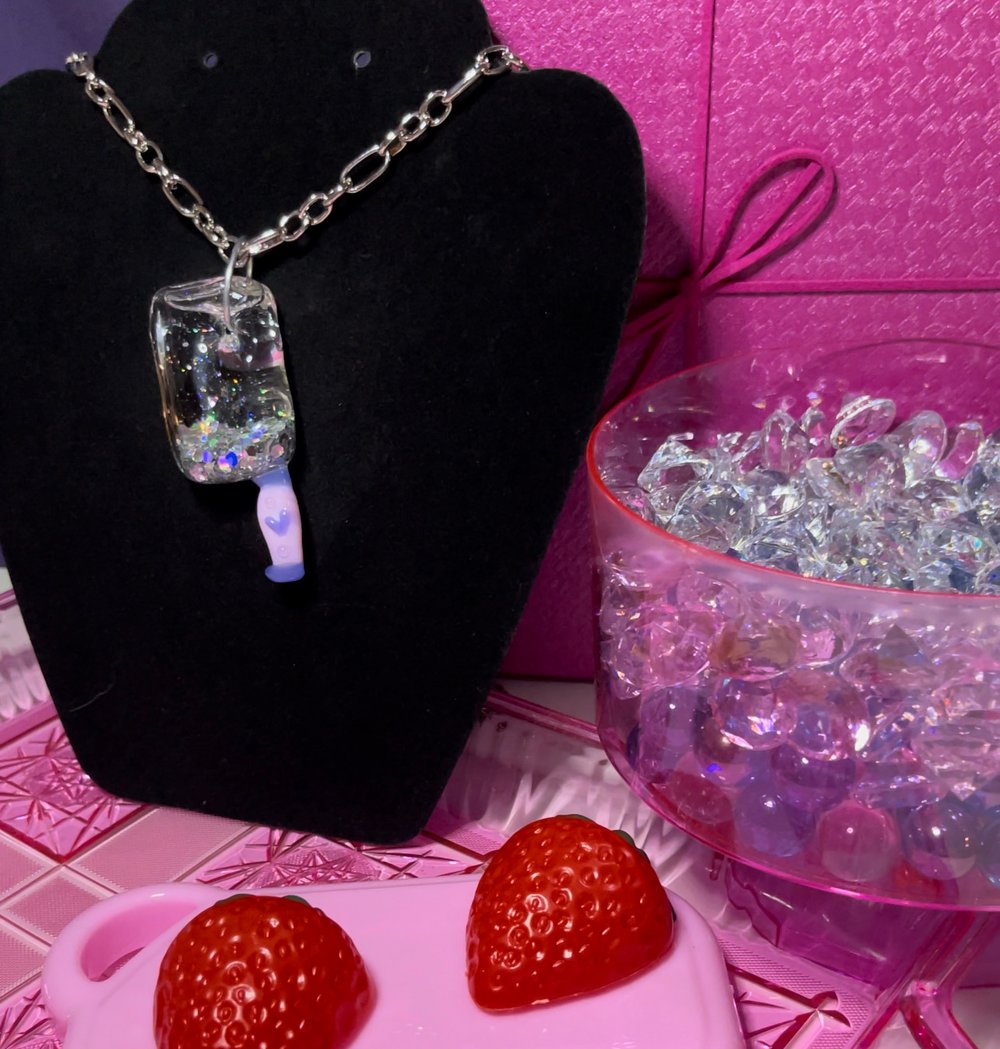 This pendant features a faux faceted blade that is filled with free-floating holographic silver glitter. It also has a heart adorned handle, hangs from a steel ring, and comes ready to wear with white and black chord options!