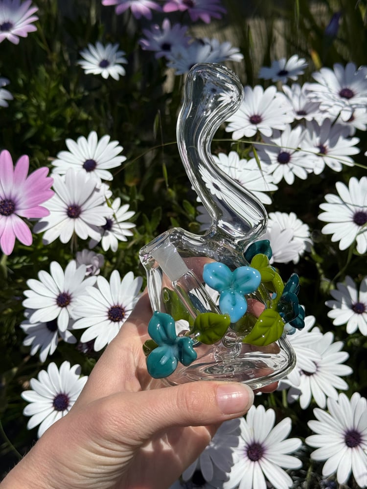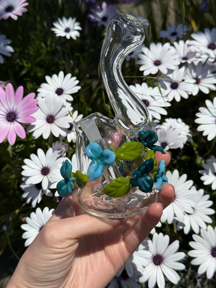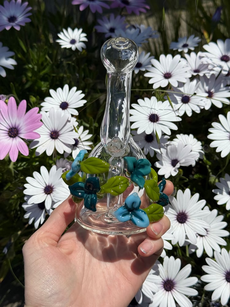 10mm 45° Collaboration with Matt King Glass, featuring 6 blue flowers in various shades and green leaves.
